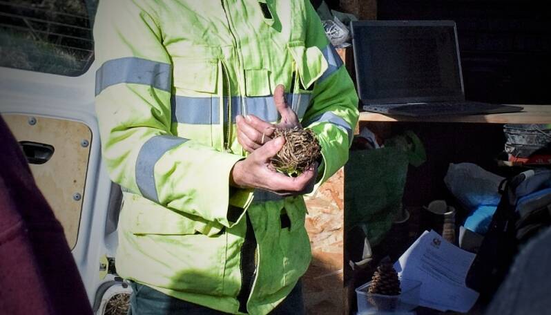 Dans un premier temps Laurence Roche de l’ONF (Office national des forêts) et Frédéric Bezet, responsable DFCI du Finistere (Défense de la Forêt contre les Incendies ) nous ont présenté leur travail, les bienfaits de l’écobuage, les contraintes en matière de sol, etc. Ils ont également expliqué ce qui constitue la flore locale et un peu la faune (comme ce nid de rats des moissons, petit nid tressé, que Frédéric Bezet tient dans ses mains / Zoom sur ce petit rongeur ICI/).